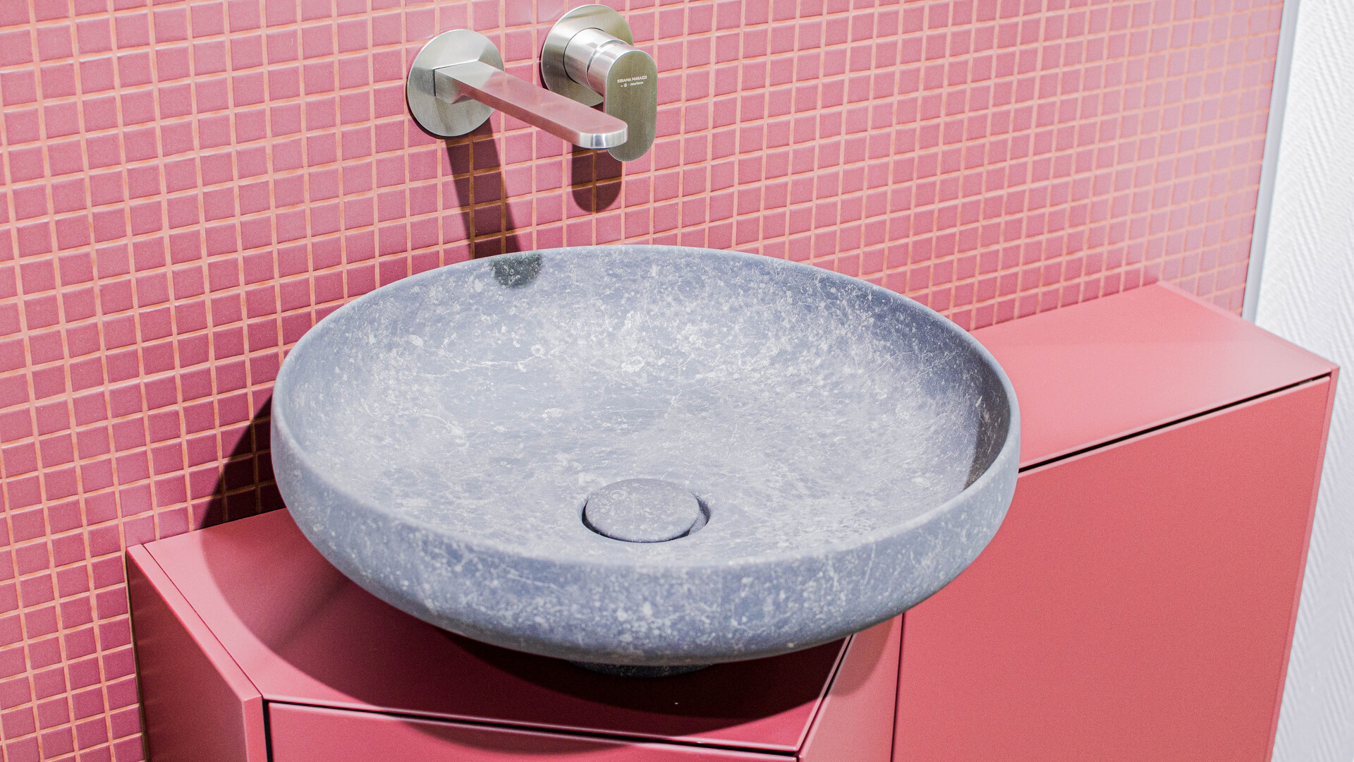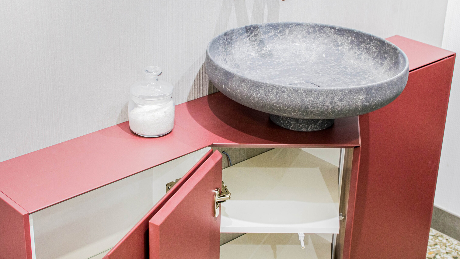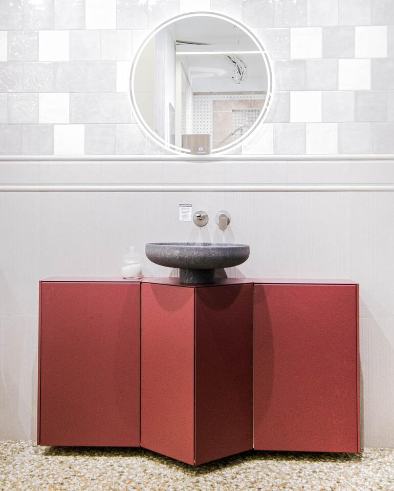 Дизайн модулей вдохновлён изящными узорами марокканских фонтанов. В коллекции представлены два типа навесных элементов: один – для хранения, второй, с острым углом – подходит как для установки раковины, так и для хранения (в этом случае будет использована столешница без отверстия). Модуль для хранения также можно использовать как компактный подвесной пенал.