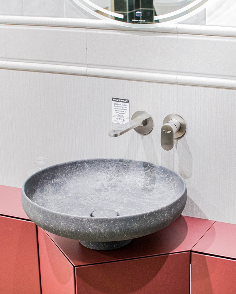 Тумба идеально сочетается с накладными раковинами KERAMA MARAZZI. Особенно эффектно она смотрится в паре с премиальной раковиной Коно: её конусовидная форма и полусферическая чаша гармонично дополняют строгий силуэт тумбы, формируя завершённый дизайнерский ансамбль. Практичность модели подчёркивают интегрированная ручка и функциональная подсветка, размещённая вдоль края выреза под раковину. Управление освещением осуществляется через бесконтактный сенсор, что делает использование тумбы удобным и гигиеничным.