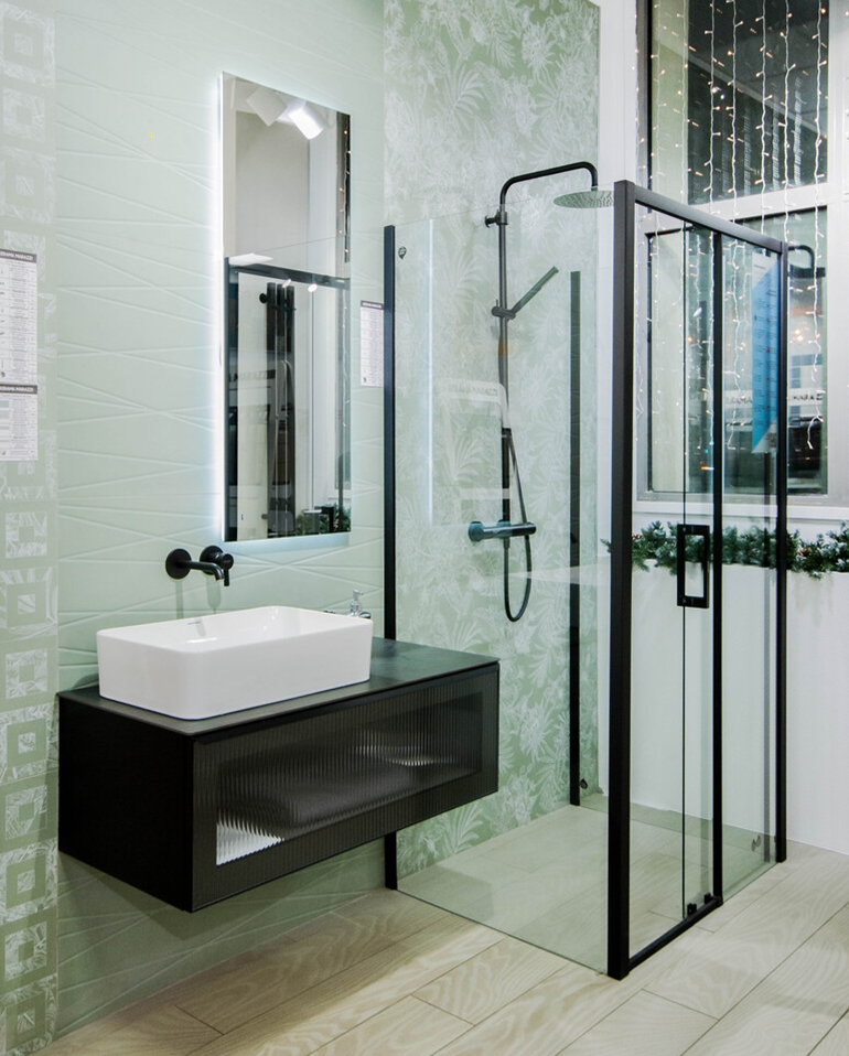 Еще одна впечатляющая новинка тумба Иконико – стильное и функциональное решение для современной ванной комнаты, сочетающее продуманный дизайн и практичную эргономику. Ширина 100 см обеспечивает достаточную вместительность при сохранении компактности. Корпус из МДФ с матовым чёрным покрытием придаёт мебели лаконичный и стильный облик. Фасад выполнен из рифлёного прозрачного стекла в обрамлении чёрного алюминиевого профиля, что создаёт выразительный визуальный контраст.