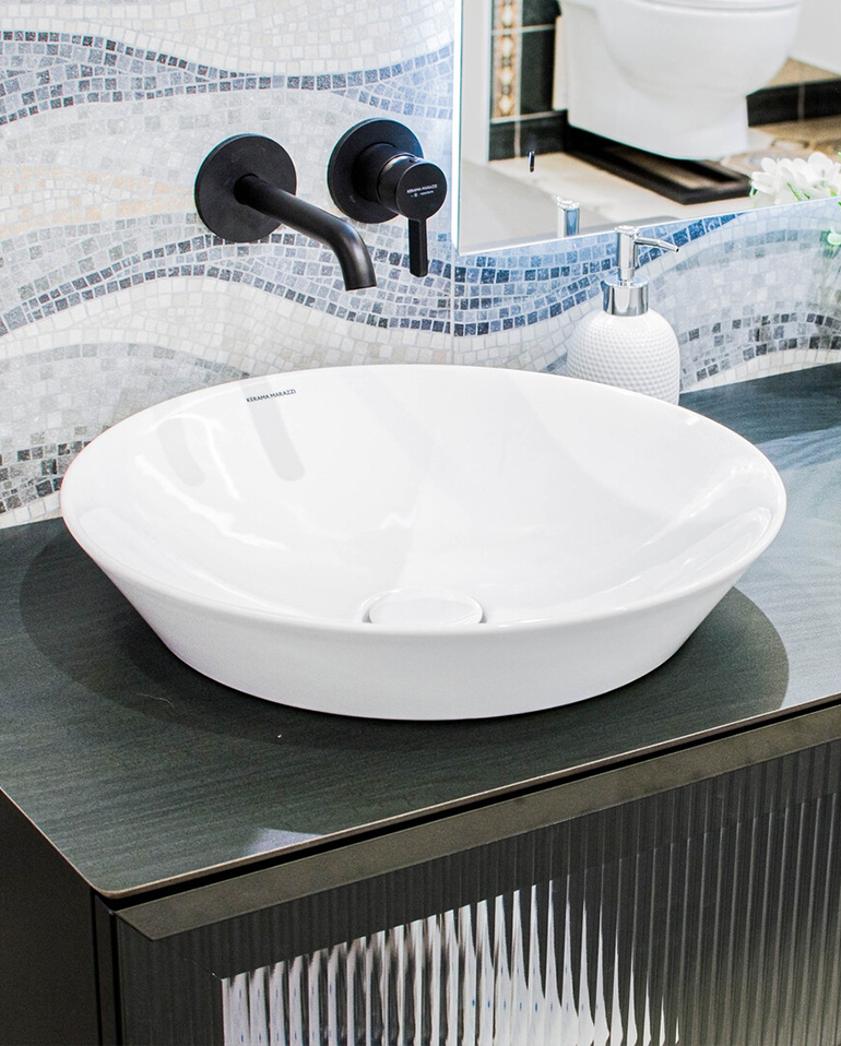 Особенно эффектно смотрится сочетание тумбы с раковиной Сафи – вместе они создают гармоничный тандем. Облик раковины определяют два ключевых элемента: утончённая ножка и просторная чаша. Широкая чаша отличается не только вместительностью, но и эргономичностью, а приподнимающая её ножка создаёт ощущение лёгкости, визуально «разгружая» общую композицию. Раковина Сафи представлена в двух цветовых решениях: чёрный камень и белый глянец.