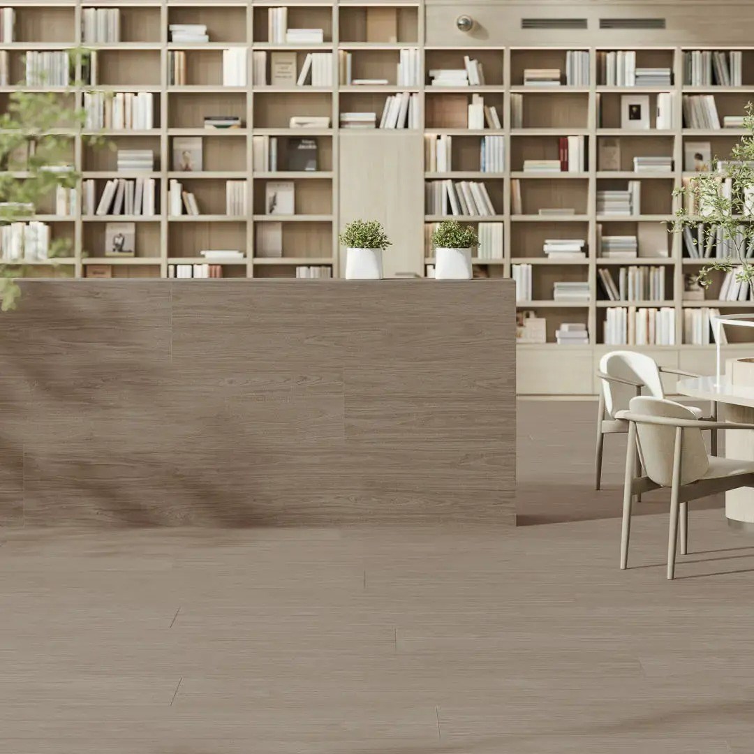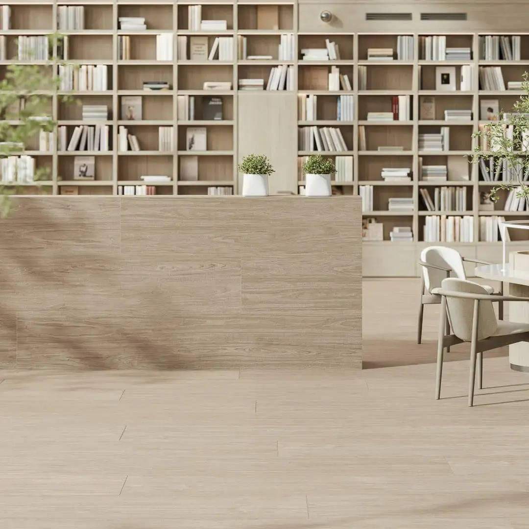 Форматы серии: 40×238,5 и 119,5×238,5 в толщине 9 мм, а также 60×119,5 в толщине 20 мм для зон с повышенной нагрузкой. Люберон подходит для гостиных, спален, столовых, холлов, террас, входных групп и коммерческих пространств, где нужна эстетика светлого дерева без компромисса по прочности.